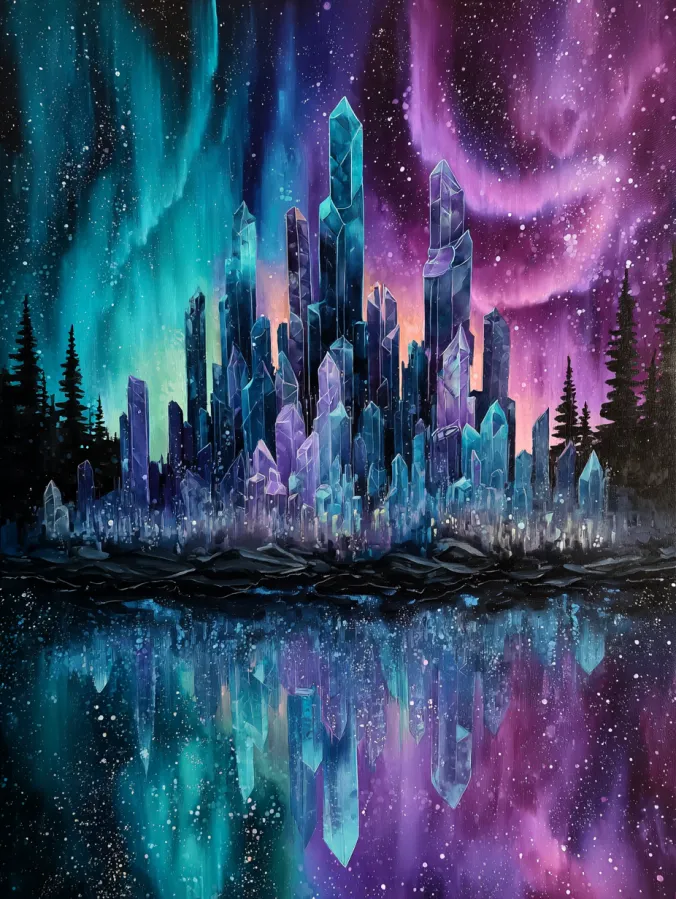 This acrylic painting shows a breathtaking crystal city rising beneath a glowing aurora sky. Tall shimmering crystals form the towers of the city with cool tones of turquoise, icy blue, and lavender catching the soft light above. The structures stretch upward like giant gemstones against a dreamy sky painted with flowing ribbons of teal, violet, and soft pink aurora lights. Dark silhouettes of pine trees frame the edges of the scene which gives the sparkling crystals even more contrast. Below the city a still lake mirrors the entire skyline with glowing reflections that ripple gently across the water. Fine star speckles scatter through the sky and across the lake surface which adds a magical sparkle to the entire composition.