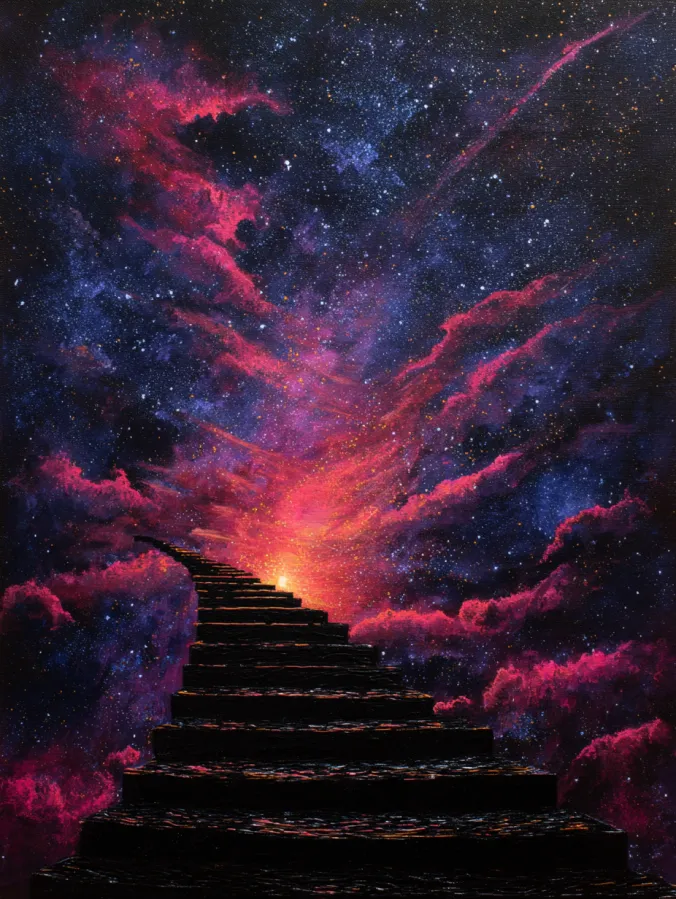 This acrylic painting shows a mysterious stairway climbing upward through a vast galaxy sky filled with glowing color. Dark stone steps begin at the bottom of the canvas and wind slowly toward a radiant light on the horizon. Around the staircase the sky explodes with swirling clouds in rich shades of crimson, magenta, deep indigo, and violet. Thousands of tiny stars sparkle throughout the background which makes the entire sky feel endless and magical. The glowing light at the end of the staircase radiates warm orange and gold tones that blend beautifully with the surrounding clouds. Bold textured brush strokes shape the dramatic clouds while scattered star speckles add a dreamy cosmic shimmer across the entire composition.