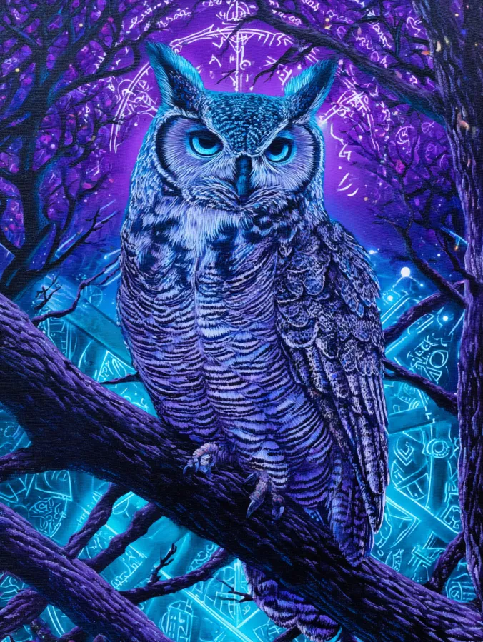 This acrylic painting features a striking owl perched on a twisted tree branch in the heart of a glowing enchanted forest. The owl sits proudly at the center with detailed feathers painted in cool shades of silver blue, lavender, and deep indigo. Its bright turquoise eyes glow softly which gives the bird an intense and mysterious presence. Behind the owl a radiant circle of magical symbols glows in shades of violet and electric blue like an ancient forest portal. Dark tree branches frame the composition on both sides while the glowing patterns create a powerful halo behind the owl. The feather textures are carefully layered with fine brush strokes that give the owl a lifelike richness while the glowing symbols add a dreamy mystical atmosphere.