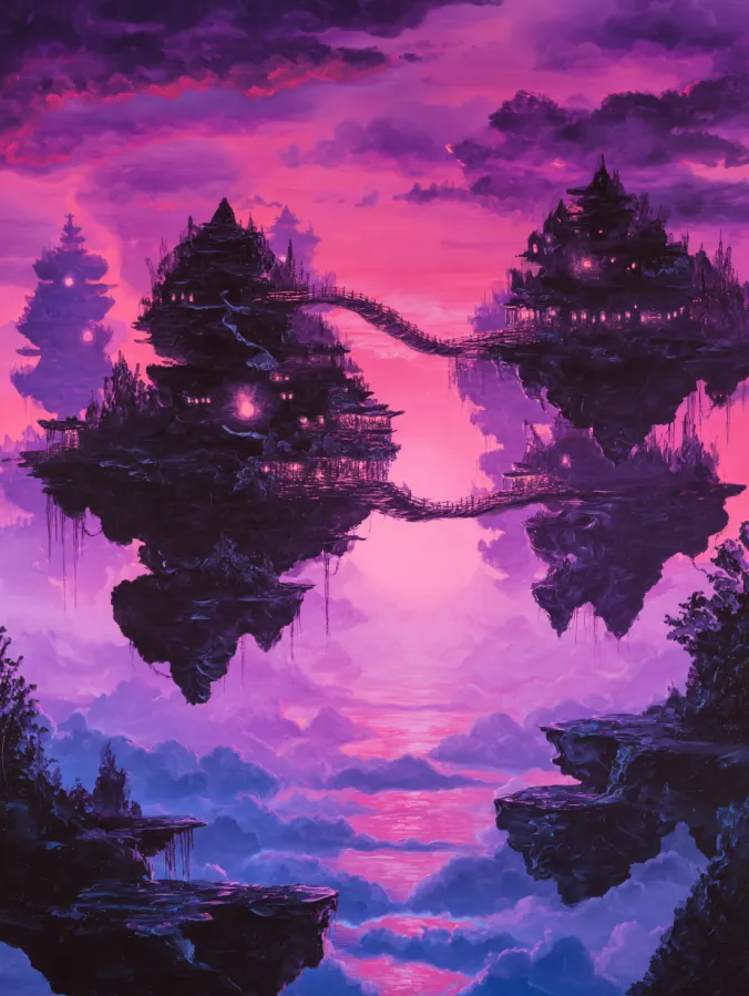 This acrylic painting shows a dreamy fantasy village built on floating islands drifting high above a sea of clouds. Two large rocky islands dominate the center of the scene with clusters of tiny glowing houses perched along their edges. Delicate bridges curve between the islands which creates a magical path connecting the floating villages. The buildings glow softly with warm pink lights that shine through the dark silhouettes of the structures. Around the islands the sky glows in rich shades of magenta, lavender, and soft coral which gives the entire scene a romantic twilight atmosphere. Wispy clouds drift through the sky below the islands and fade into deeper purple tones toward the horizon. Smooth blended brush strokes shape the sky while the rocky islands and tiny buildings add intricate layered details.
