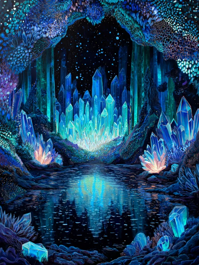 This acrylic painting reveals a breathtaking crystal cave glowing softly in shades of blue and turquoise. Tall shimmering crystal formations rise from the cave floor like natural towers made of glassy light. The crystals frame a peaceful lake that reflects the sparkling shapes and the starry sky visible through the cave opening. Around the cave walls clusters of glowing gemstones and mineral textures add layers of cool blues, soft aquas, and hints of pale lavender. Tiny specks of light float through the air like magical dust which makes the cave feel alive with quiet energy. The brushwork blends smooth reflective water with crisp edges on the crystal shapes which gives the entire scene a rich luminous glow.
