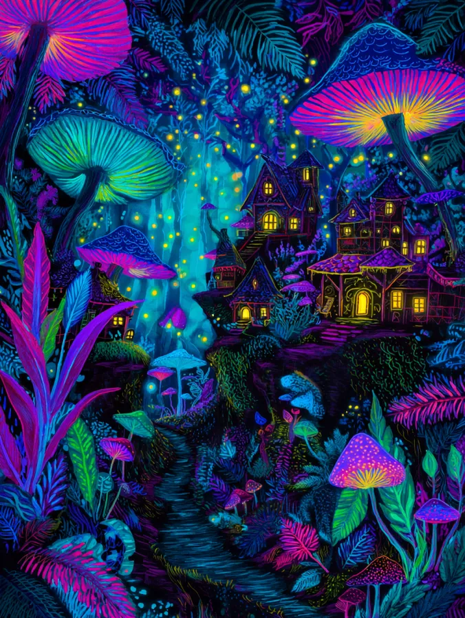 This acrylic painting bursts with color and fantasy charm. A tiny woodland village sits beneath towering glowing mushrooms that stretch across the scene like magical umbrellas. The forest glows with electric blues, neon pinks, deep purples, and bright turquoise tones that feel almost luminous against the dark jungle background. Small cozy houses with golden windows cluster along a winding forest path that disappears into the glowing trees. Fireflies float throughout the air like tiny stars, adding soft dots of light across the composition. Bold leafy plants frame the foreground while layered mushrooms and dreamy forest shapes create depth. The brushwork looks rich and textured with glowing highlights on the mushrooms and vibrant strokes that make every leaf and plant feel alive.