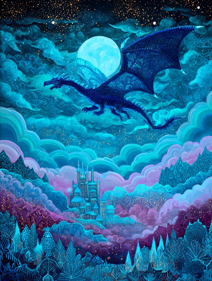 This acrylic painting shows a magical night sky where a graceful dragon glides across glowing clouds beneath a bright full moon. The dragon stretches across the upper part of the canvas with detailed wings filled with delicate patterns and rich shades of deep blue. The sky behind it sparkles with tiny golden stars scattered across soft turquoise clouds that swirl across the scene. Below the sky sits a dreamy kingdom tucked into a glowing valley. A tall castle rises from the center surrounded by soft purple hills and stylized trees painted in cool blues and lavender tones. The composition flows beautifully from the intricate dragon in the sky down to the peaceful landscape below. Layered brush strokes create soft glowing clouds while finer details add texture to the dragon scales and castle towers.