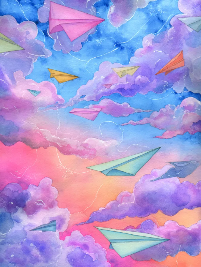 Soft watercolor clouds swirl across the page in dreamy shades of lavender, blush pink, and sky blue, creating a layered, airy sky that feels full of movement. Colorful paper airplanes glide gently through the clouds, each one painted with smooth washes and slightly uneven edges that show off those lovely watercolor bleeds. The composition feels light and spacious, with the planes scattered at different depths so your eye keeps wandering around the scene in the best way.