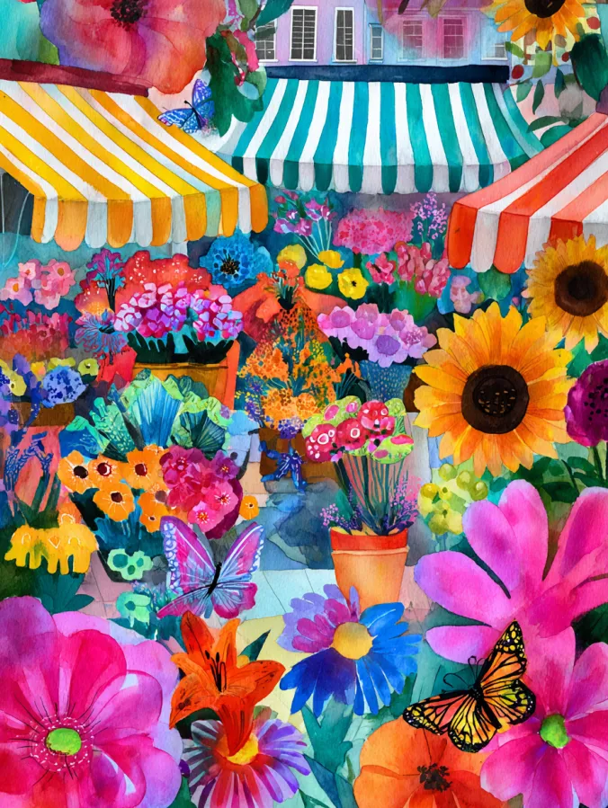 This watercolor scene overflows with bright blooms in pinks oranges yellows and blues, layered tightly together to create a lively flower market full of charm. Striped awnings in cheerful colors frame the top of the painting, adding structure while still keeping things playful. Loose brush strokes and bold washes give the flowers a fresh hand painted feel, with butterflies fluttering through the scene to add movement. The composition feels full and energetic, yet balanced enough that your eye can wander happily from one flower to the next.