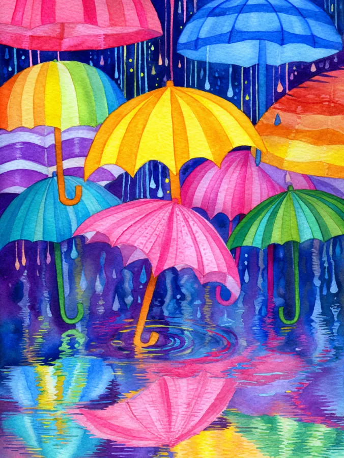 Bright watercolor umbrellas fill the scene in joyful shades of pink yellow teal purple and blue, layered closely together against a deep rainy background. The brush strokes are soft and flowing, especially in the falling rain where thin lines melt into the darker washes. Reflections ripple across the water below, blending colors into a dreamy mirror effect that adds depth and movement. The overall layout feels lively and cozy at the same time, with the umbrellas creating a playful pattern that pulls your eye across the painting.