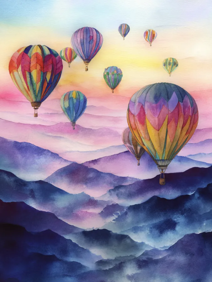 Gentle watercolor layers build a peaceful sky filled with warm sunrise tones that fade into soft pinks and light blues. Colorful hot air balloons float effortlessly across the scene, each one painted with simple patterns and smooth blended washes. Below them, misty mountain layers stack into the distance using loose brush strokes and subtle color shifts that create depth without heavy detail. The composition feels open and calm, with plenty of space that lets the balloons breathe and glide across the page.