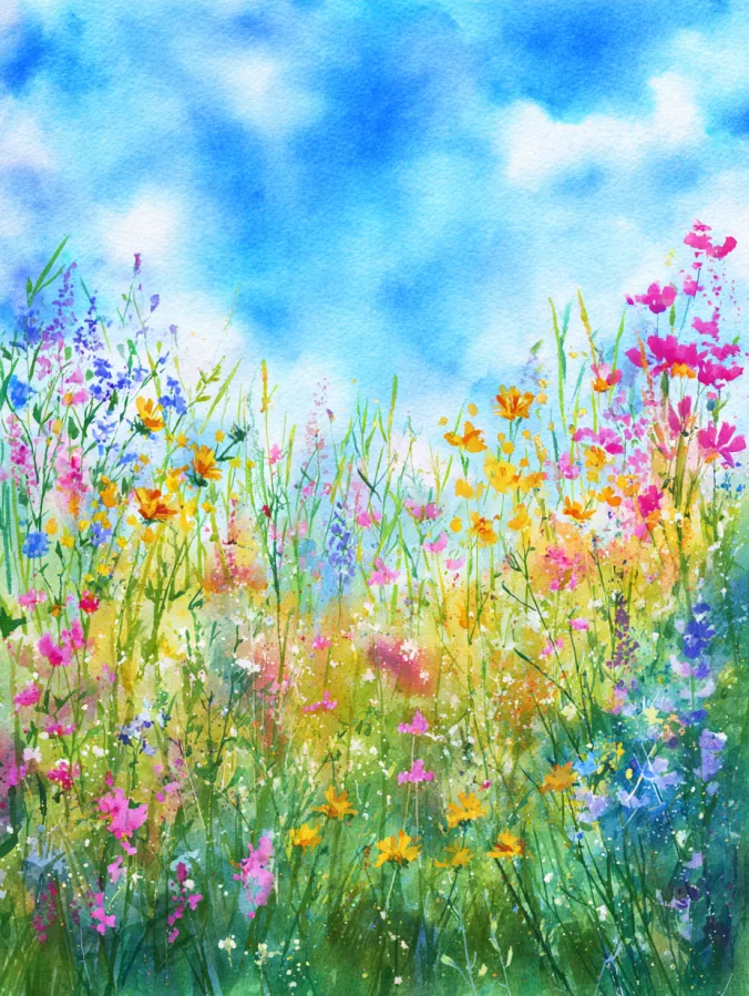 Loose watercolor strokes bring a cheerful meadow to life with tall grasses and scattered wildflowers in pink yellow purple and soft blue tones. The sky above is painted with gentle washes that fade naturally, giving the scene an open and airy feel. Splattered details and uneven edges add texture and movement, making the flowers look like they are swaying in a light breeze. The composition feels relaxed and natural, with no strict lines and plenty of space for color to flow.