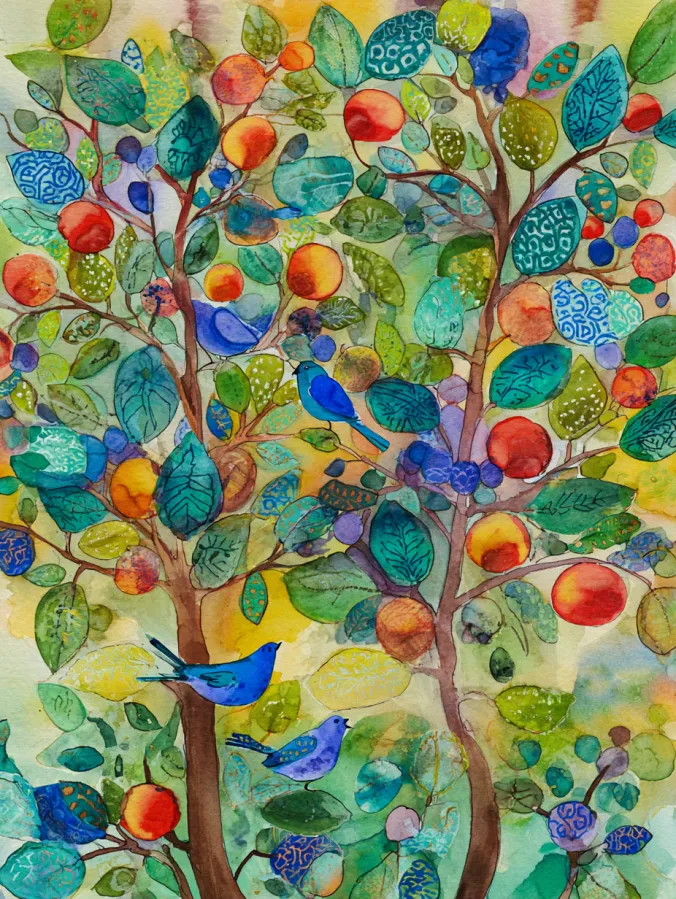This watercolor painting features two lively trees bursting with rounded leaves in shades of green teal orange and soft blue, layered closely to create a full and cheerful canopy. Each leaf has its own little pattern or texture, giving the whole piece a whimsical handcrafted feel. Bright blue birds perch throughout the branches, adding pops of color and gentle movement. The brush strokes are loose and expressive, with soft blends in the background that keep the scene light and welcoming rather than busy.
