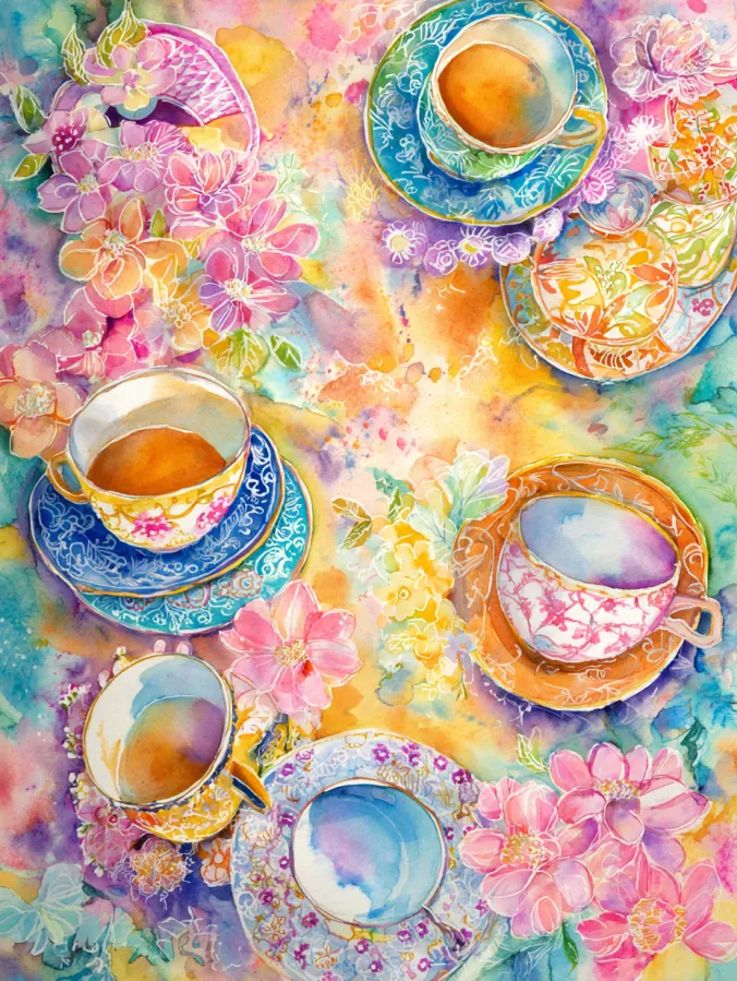This watercolor illustration is filled with delicate teacups and saucers painted in soft blues warm golds and gentle pastels, layered across a vibrant floral background. Loose washes blend pinks yellows and greens together, while fine white line details outline flowers and patterns on the cups for a dreamy hand drawn touch. The composition feels light and flowing, with the teacups drifting naturally across the page instead of sitting in neat rows. Everything blends together beautifully, creating a playful mix of structure and softness.