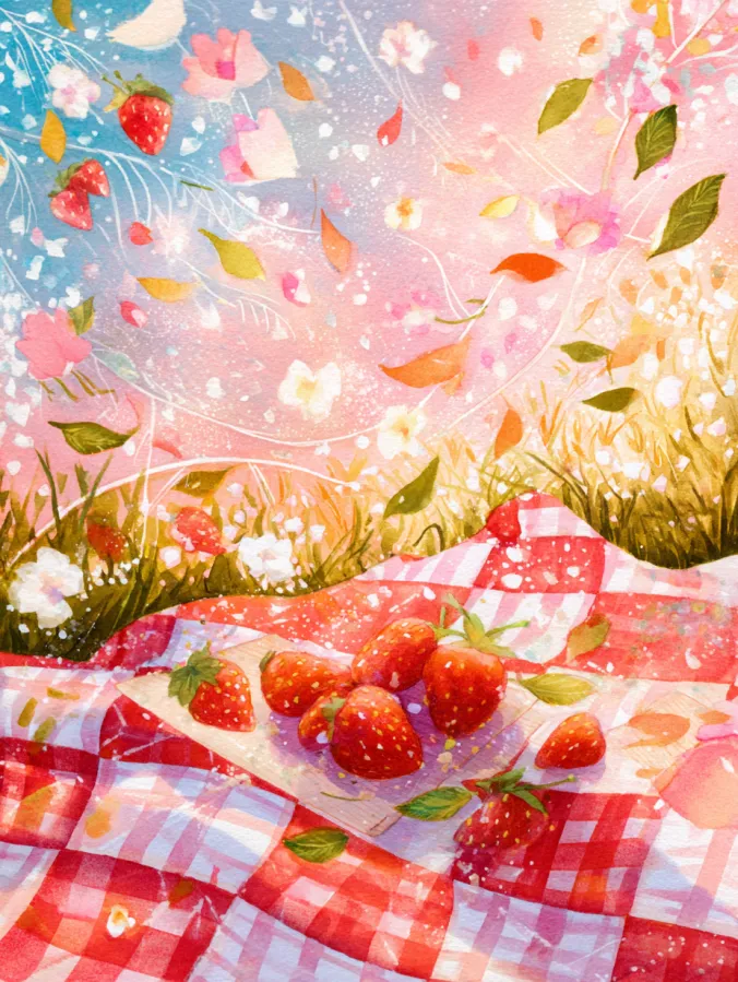 This watercolor scene captures a cozy picnic moment with bright red strawberries resting on a gingham blanket painted in warm pinks and creamy whites. Loose washes blend across the sky in pastel blues and peach tones, while petals and leaves swirl gently through the air with fine flowing lines. The brush strokes feel light and playful, especially in the grass and background where colors bleed naturally into one another. The composition keeps the strawberries as a cheerful focal point while the airy details add movement and charm.