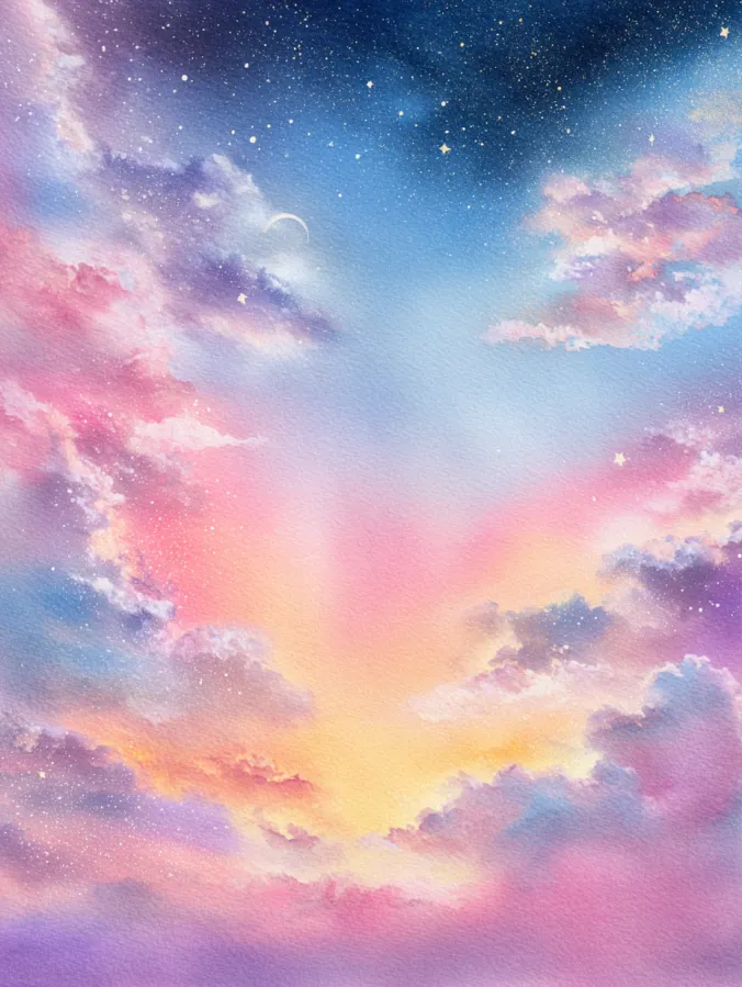 Gentle watercolor washes blend peach pink lavender and soft blue into a glowing sky that feels calm and dreamy. Fluffy clouds float across the page with smooth layered brush strokes, their edges melting naturally into the background. Tiny stars and a delicate crescent moon add quiet sparkle without taking over the scene. The composition feels open and balanced, with light flowing upward and plenty of space that lets the colors breathe.