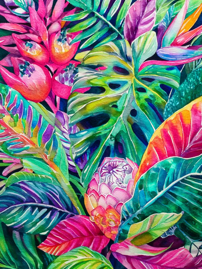I love painting tropical scenes like this because they feel instantly energizing and creative. Mixing greens with unexpected pops of pink and purple keeps things exciting without being stressful. I can focus on shapes and color layering instead of tiny details, which makes the process really relaxing. It is the kind of painting that feels playful and bold and always leaves me feeling inspired when I am done.