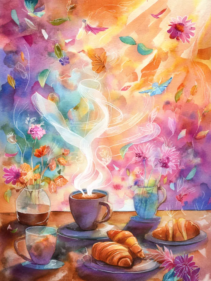 Warm watercolor washes blend across the page in glowing shades of peach gold coral and soft violet, creating a dreamy background that feels almost sunlit. A cozy table scene sits at the bottom with steaming cups and flaky croissants painted in loose expressive brush strokes. Delicate white line work swirls upward from the mugs like scented steam, carrying petals leaves and tiny blossoms through the air. The composition feels full but gentle, with layered colors and soft edges that keep everything light and whimsical instead of busy.