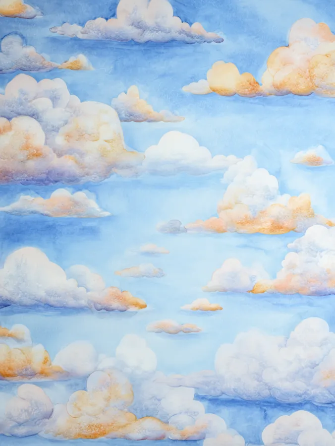 This watercolor painting features fluffy clouds scattered across a bright blue sky, painted in soft whites with gentle hints of warm peach and pale gold. The brush strokes are smooth and airy, with layered edges that give the clouds a pillowy and floating look. The composition feels open and spacious, with clouds placed at different sizes and distances to create a calm sense of depth. Everything blends naturally, keeping the scene light and peaceful.