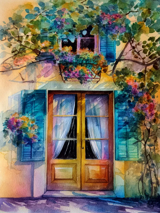 I love painting scenes like this because they feel calm and personal at the same time. There is something so relaxing about layering plants and flowers around a simple structure. I can take my time adding color and texture without worrying about perfection. It feels engaging in a gentle way and always leaves me with that cozy creative satisfaction when I finish.