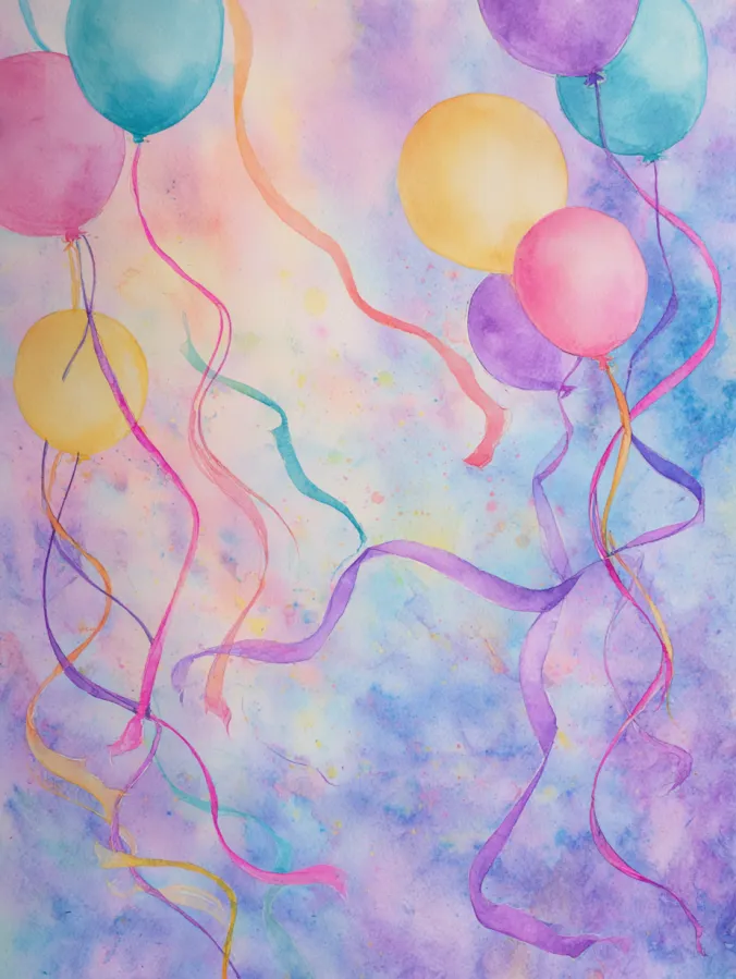 This watercolor painting features pastel balloons drifting gently across a dreamy background of soft blues pinks and lavender. Long flowing ribbons trail behind each balloon, painted with loose graceful strokes that add movement and lightness to the scene. The background blends smoothly with subtle splatters and gentle color shifts, giving everything an airy and playful feel. The composition feels open and balanced, with plenty of space that lets the balloons float freely.