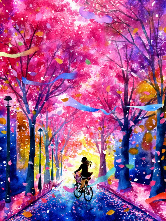 Vibrant watercolor washes flood the scene with rich pinks purples blues and glowing yellows, creating a dreamy tree lined street bursting with falling petals. Tall trees frame the composition on both sides, their branches loose and expressive with splattered textures that feel lively and spontaneous. At the center a small silhouetted cyclist rides toward a warm glowing light, giving the whole painting a sense of movement and gentle storytelling. The layered background and soft bleeding edges make everything feel magical and slightly blurred like a perfect memory.