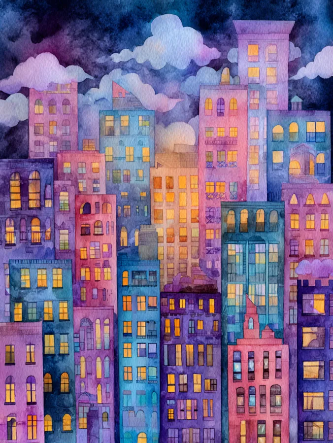 Soft watercolor blocks stack upward to form a charming city skyline filled with tall buildings in shades of violet teal rose and deep blue. Each structure is painted with loose washes and slightly uneven edges, giving the city a cozy storybook feel rather than a sharp realistic look. Warm glowing windows scatter across the buildings, creating a lovely contrast against the cool night sky and fluffy painted clouds drifting above. The composition feels full and balanced, with layered shapes that guide the eye from bottom to top.
