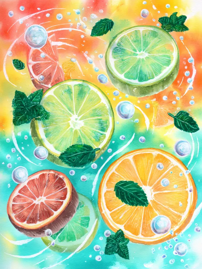 Juicy watercolor slices of lime orange and grapefruit float across a lively background of teal sunshine yellow and coral tones. The brush strokes feel fresh and loose, with visible textures that make the fruit look slightly translucent and full of life. Tiny bubbles and swirling white accents move around the slices, creating a sense of motion like everything is gently spinning in sparkling water. The layout feels balanced but playful, with each citrus piece placed at different angles so the whole painting feels energetic and bright.