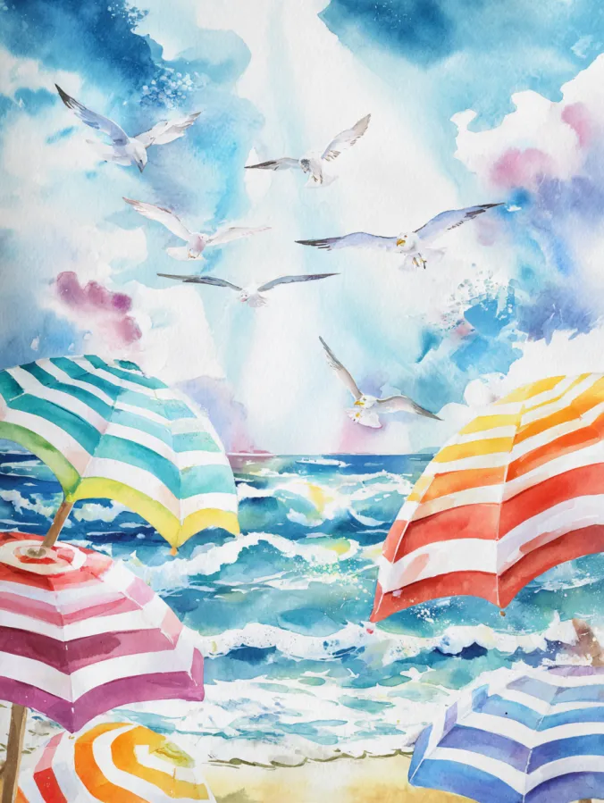 Fresh watercolor washes capture a lively seaside scene filled with rolling blue waves, soft sandy tones, and striped beach umbrellas in cheerful shades of coral teal sunshine yellow and aqua. The brush strokes are loose and fluid, especially in the ocean where the colors blend and bleed into each other naturally. Seagulls glide across the sky with light airy strokes, adding movement and balance to the composition. The umbrellas anchor the foreground while the open sky and sea create a spacious relaxed layout.