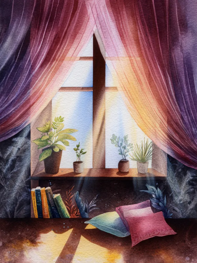 Soft watercolor layers build a peaceful interior scene centered around a tall window framed by flowing curtains in warm rose and muted purple tones. Gentle light spills across the room, creating long dreamy shadows that give the painting a calm afternoon feel. Small potted plants sit along the windowsill with loose leafy brush strokes, while stacked books and cozy pillows add balance and warmth to the composition. The colors blend smoothly with natural texture, making the whole scene feel inviting and quietly lived in.