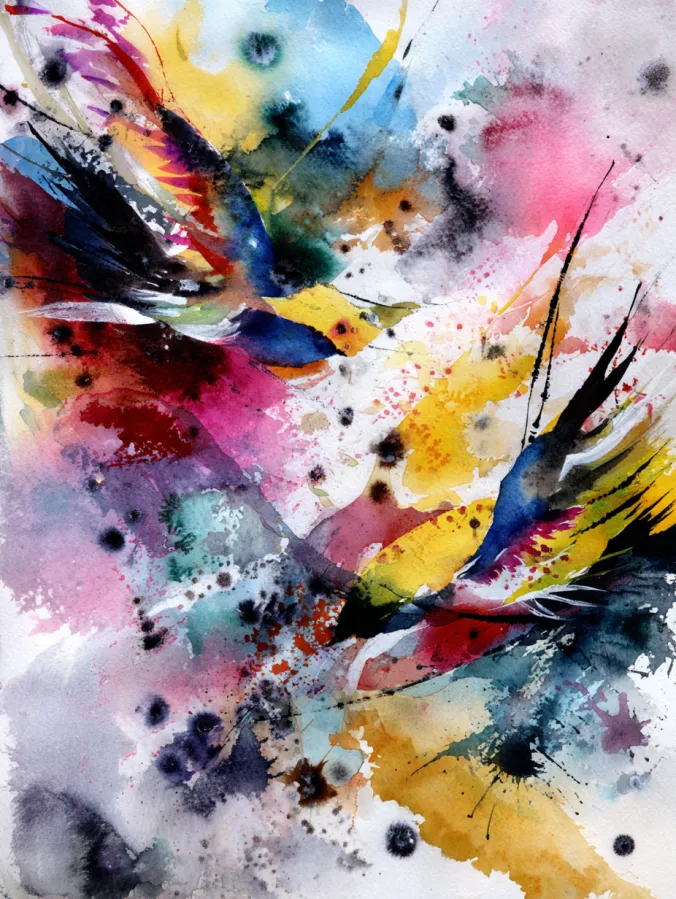 Bold watercolor splashes burst across the page in energetic shades of magenta sunshine yellow teal and deep navy, creating a lively abstract background full of texture and contrast. Two birds take shape through loose layered strokes, with their wings suggested by sweeping lines and dramatic color shifts rather than sharp details. Paint splatters and soft blooms add movement and spontaneity, making the whole composition feel free and dynamic instead of controlled. The layout feels balanced but wild in a good way, like the birds are caught mid flight in a moment of pure motion.
