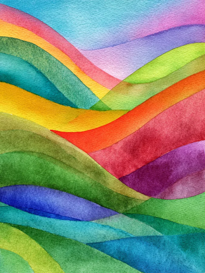 This watercolor design features smooth, overlapping waves that glide across the page in a joyful mix of saturated rainbow hues. Soft blues, greens, yellows, reds, and purples melt into one another with gentle gradients and visible paper texture shining through. The brush strokes feel loose and fluid, with natural bleeds that create organic edges and a sense of movement. Everything feels layered yet simple, filling the frame with color while still staying airy and balanced.