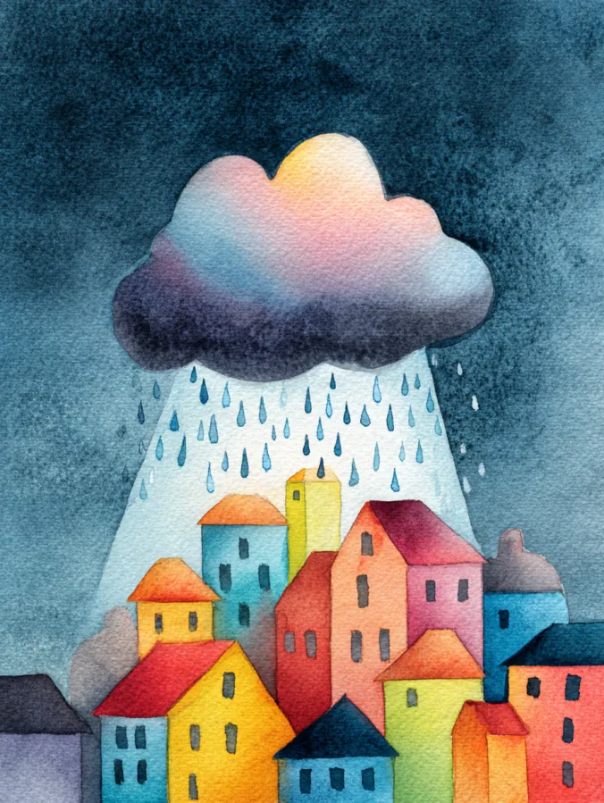 This watercolor painting shows a cozy little town made of simple, colorful houses sitting beneath a soft rain cloud. The buildings are painted in cheerful shades of yellow, coral, teal, and blue, with loose edges and gentle shading. Above them, a fluffy cloud floats in a moody blue sky, releasing playful raindrops that fall straight down like tiny beads. The brush strokes feel soft and relaxed, with visible watercolor texture and smooth blends that keep the scene charming and lighthearted.