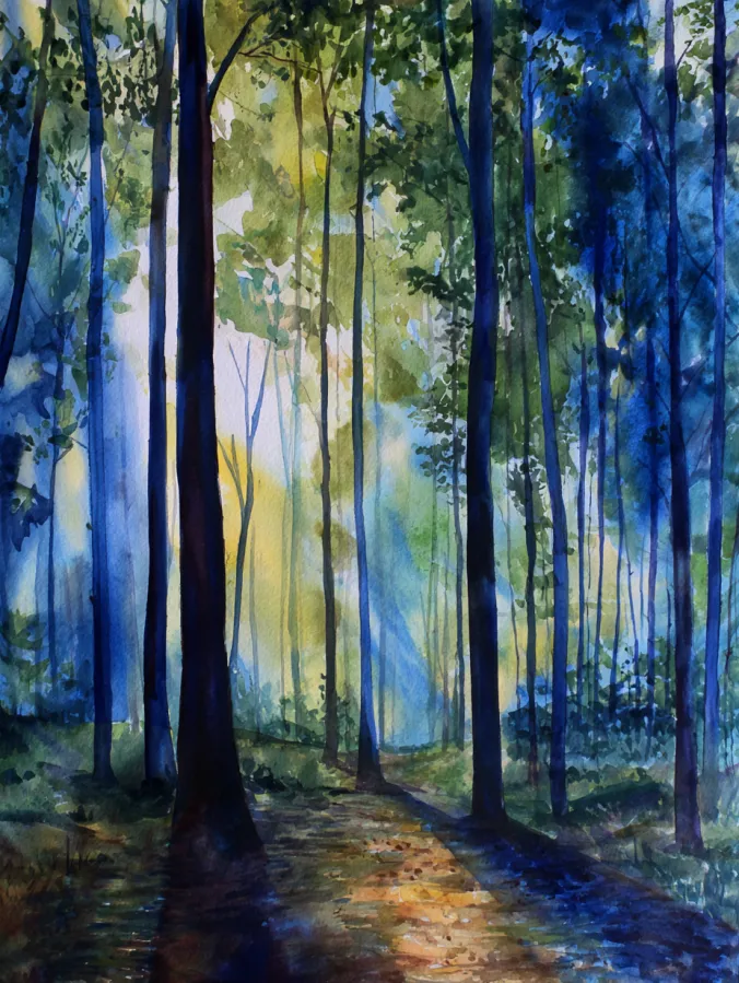 This watercolor painting shows a peaceful forest scene with tall, slender trees reaching upward in deep blues and rich greens. Soft sunlight filters through the leaves, creating warm golden highlights that glow against the cooler shadows. The brush strokes are loose and layered, especially in the foliage, giving the scene a natural and slightly dreamy feel. A gentle path winds through the center, drawing the eye into the forest and adding a calm sense of depth and movement.