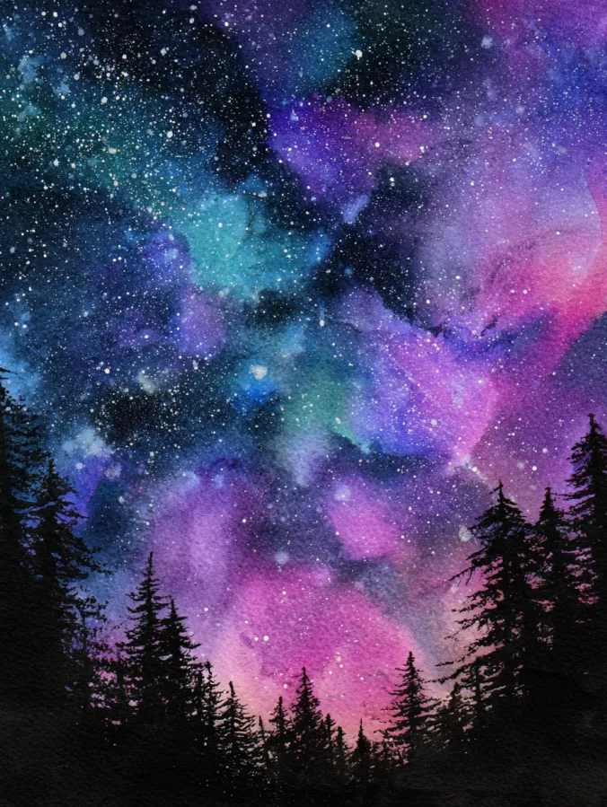 This watercolor painting shows a dreamy galaxy sky swirling with deep blues, purples, teals, and soft pinks. The colors blend together in cloudy layers, creating a rich cosmic texture filled with tiny white stars scattered across the sky. Dark silhouettes of pine trees frame the bottom of the scene, grounding the vibrant sky and adding contrast. The brush strokes feel loose and atmospheric, with splatter details that give the stars a magical, glowing effect.
