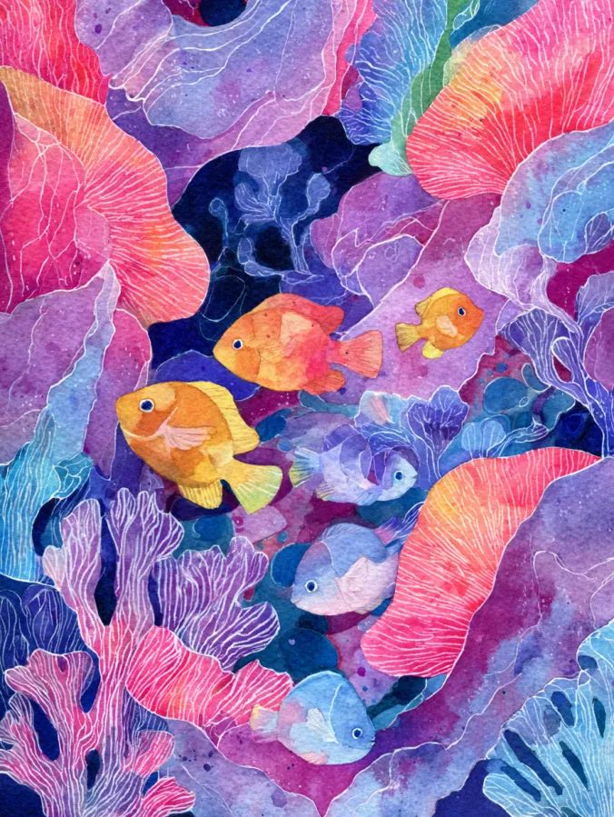 I love this kind of painting because it feels playful and creative from start to finish. There is so much freedom to mix colors, layer shapes, and keep things loose without stressing about realism. Painting fish and coral is relaxing but still exciting, especially when the colors start interacting on the paper. It always puts me in a good mood and feels like a mini creative escape, which makes it perfect for a fast creativity boost.