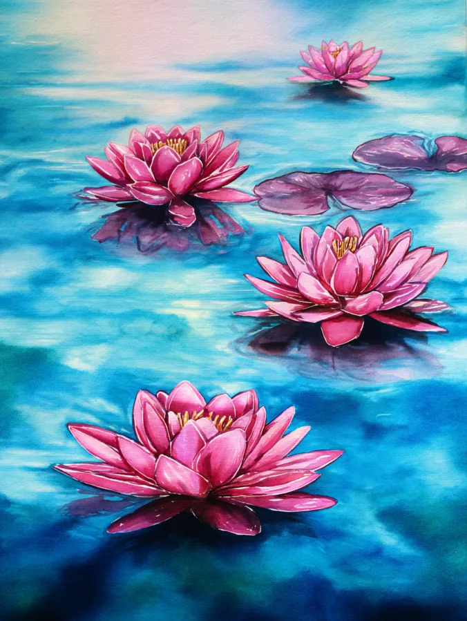 I love painting lotus flowers like this because it instantly puts me in a calmer headspace. There is something so soothing about working layer by layer on the petals and letting the water create natural movement in the background. It feels relaxing without being boring, and the result always looks more impressive than the effort it takes. This is one of those paintings that helps me slow down and enjoy the moment while still feeling creative and inspired.