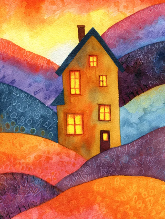 This watercolor painting shows a charming little house tucked into rolling hills of warm oranges, purples, and soft blues. The windows glow with a golden light, creating a cozy contrast against the textured, layered background. The hills flow in gentle curves around the house, painted with loose brush strokes and playful patterns that add visual interest. The colors blend beautifully, giving the whole scene a warm, storybook feel that feels both dreamy and inviting.