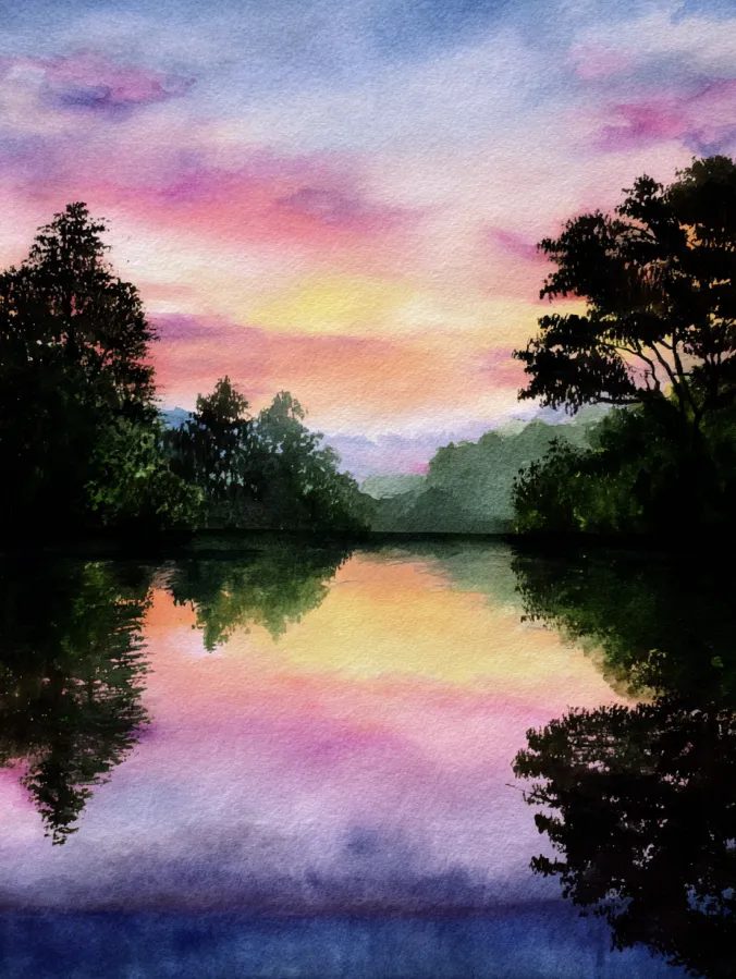 Glowing Sunset Reflection Watercolor