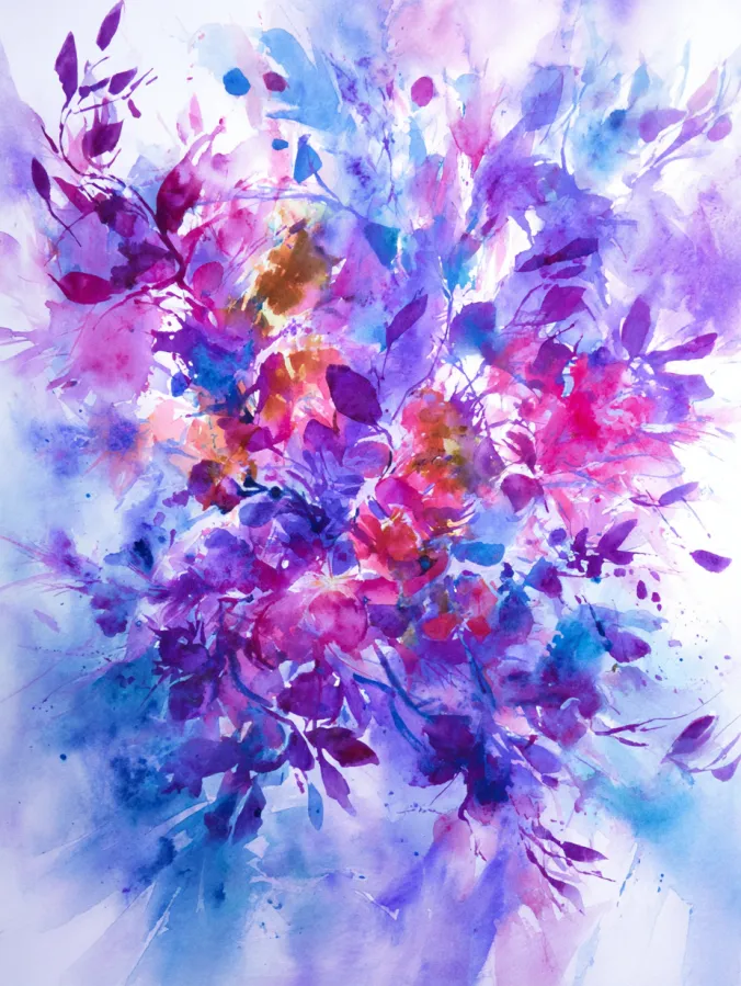 This watercolor painting bursts with energetic floral shapes and leafy forms layered in vibrant purples, pinks, blues, and hints of warm gold. The brush strokes are loose and expressive, with splashes, drips, and soft blends creating a sense of movement across the page. Flowers and foliage overlap in a wild, organic arrangement that feels full and alive without being overly detailed. The background stays light and airy, letting the colors pop while visible watercolor textures add depth and personality.