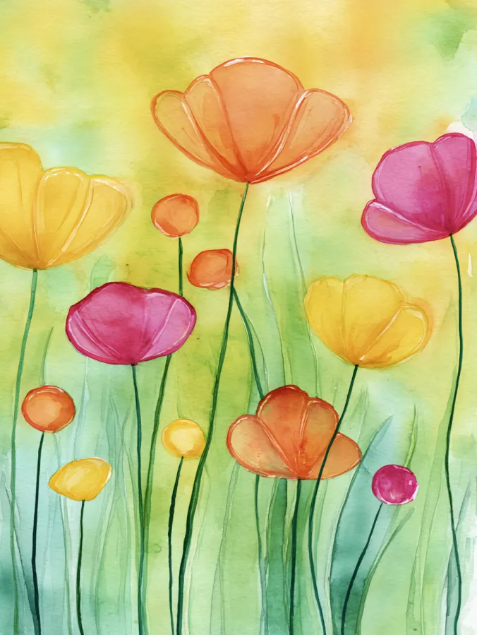 This watercolor painting shows a cheerful meadow filled with tall, whimsical flowers in warm shades of yellow, coral, peach, and pink. The petals are loose and slightly translucent, layered with soft outlines that give each bloom a gentle glow. Slender green stems stretch upward through a wash of fresh greens and sunny yellows in the background. The brush strokes feel relaxed and fluid, with natural color bleeds that keep the whole scene light, airy, and full of movement.