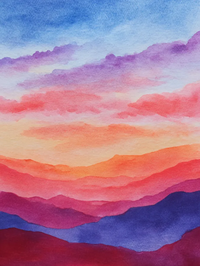 Layered Sunset Mountain Watercolor
