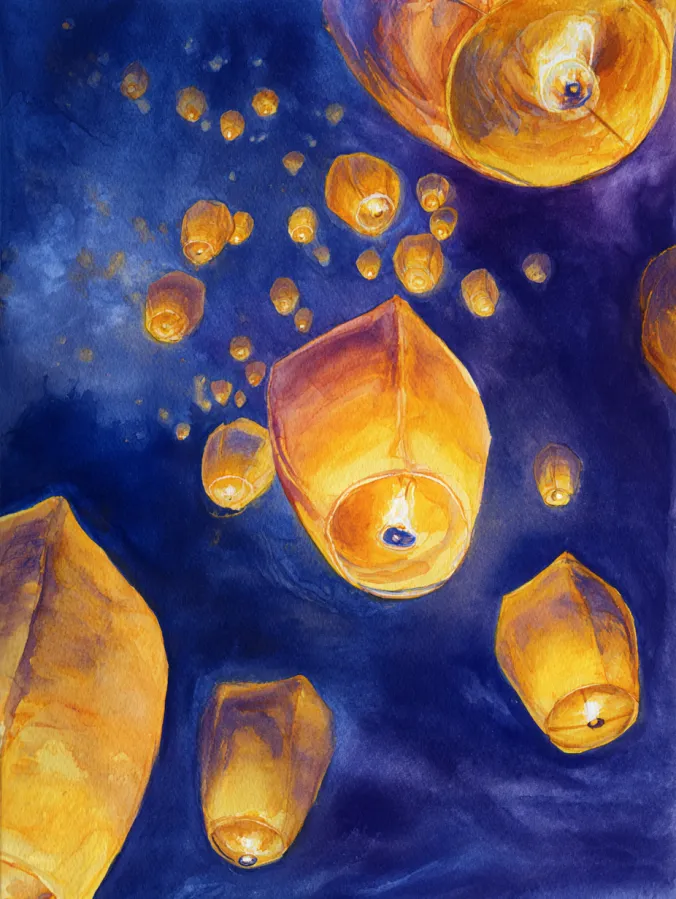Glowing Floating Lantern Night Watercolor