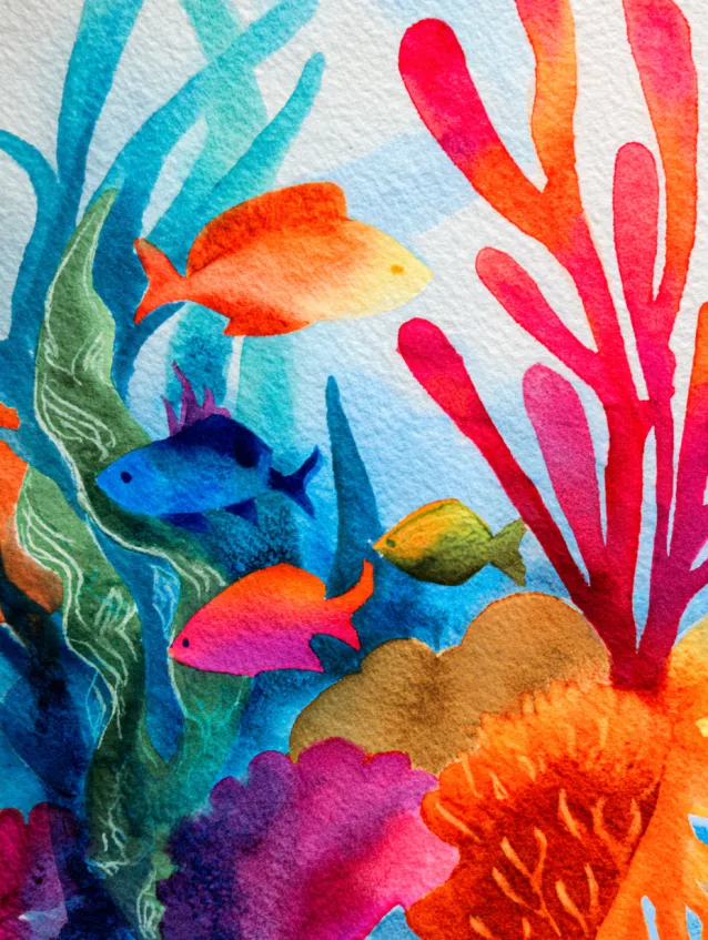 This watercolor painting bursts with tropical energy, featuring bright orange and blue fish swimming through flowing coral and sea plants. The composition feels lively yet simple, with soft blends of turquoise water in the background and pops of pink and red coral reaching upward. The brush strokes are loose and fluid, letting the colors bleed naturally into each other, which gives the whole piece that dreamy underwater glow. The layout feels full and immersive without being overwhelming, making the ocean scene feel playful and inviting.