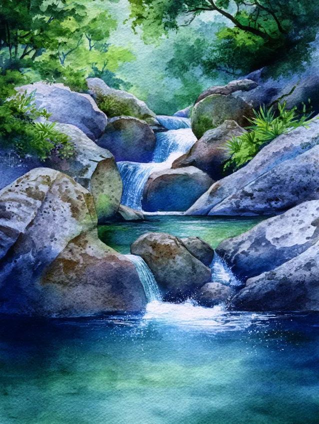 This watercolor painting shows a small waterfall flowing between rounded rocks surrounded by lush greenery. The water is painted in layered blues and greens, with soft highlights suggesting movement. The rocks are gently shaded to create depth, while the foliage frames the scene naturally. The composition leads the eye from the top of the falls down into the reflective pool below.