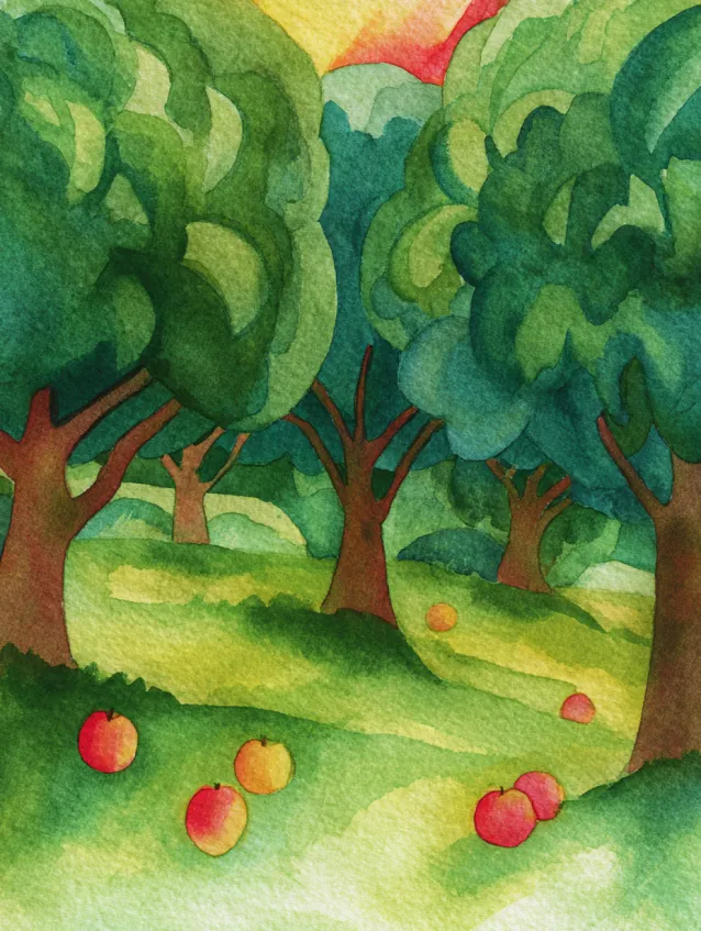 This watercolor painting shows a bright orchard filled with rounded green trees and scattered red apples resting on soft grassy hills. The trees are painted with loose circular brush strokes that blend different shades of green, giving them a full and playful look. The background fades gently into lighter greens and warm sky tones, creating depth without heavy detail. The composition feels open and cheerful, with simple layering that makes the scene easy to follow.