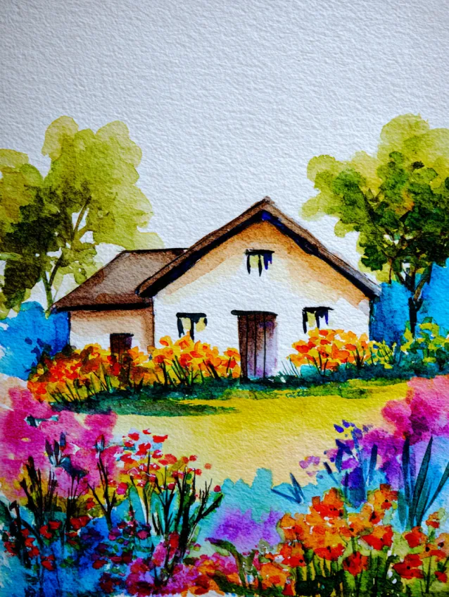 This watercolor painting features a charming little cottage surrounded by vibrant flower beds in pinks, oranges, and purples. The house sits at the center, framed by soft green trees and a bright lawn that leads the eye toward the doorway. The flowers in the foreground are painted with loose, colorful strokes, adding depth and energy without overwhelming detail. The whole layout feels warm and inviting, like a peaceful countryside afternoon.