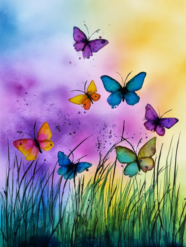 This watercolor painting captures a dreamy meadow filled with tall grass and floating butterflies in bright shades of purple, blue, yellow, and pink. The background blends soft pastel washes that melt into each other, giving the sky a magical glow. The butterflies are scattered across the composition, adding movement and lightness. The grass strokes rise gently from the bottom, grounding the colorful wings above.