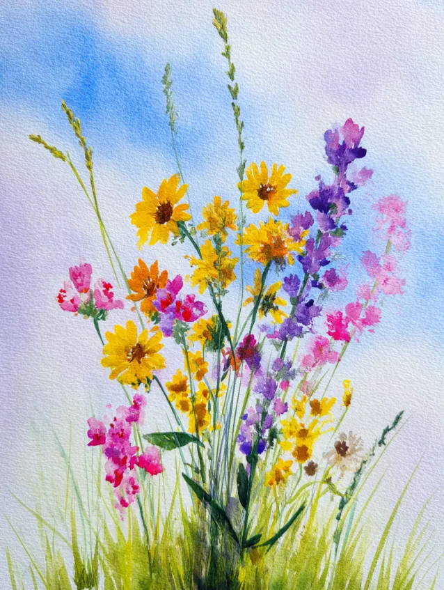 This watercolor painting showcases a tall arrangement of wildflowers in soft pinks, sunny yellows, and gentle purples against a light airy background. The stems are thin and slightly curved, giving the bouquet a natural flow. The petals are painted with light dabs and soft blends, creating texture without heavy outlines. The negative space around the flowers keeps the composition fresh and elegant.