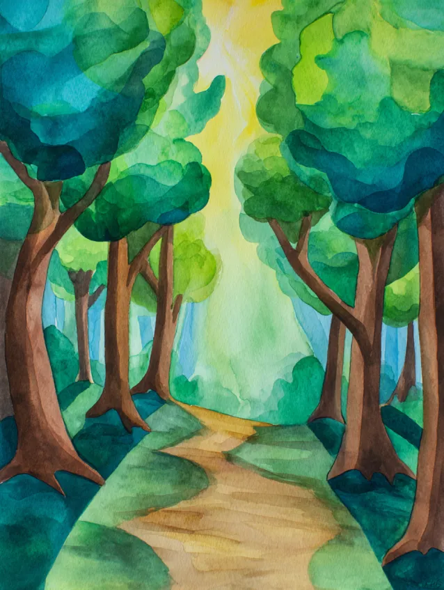 This watercolor painting features a winding path leading through tall green trees with soft sunlight filtering between them. The trunks are slightly darker, while the foliage is layered in various shades of green to create depth. The path curves gently toward the center, inviting the viewer into the scene. The overall composition feels balanced and calm with subtle shading along the ground.