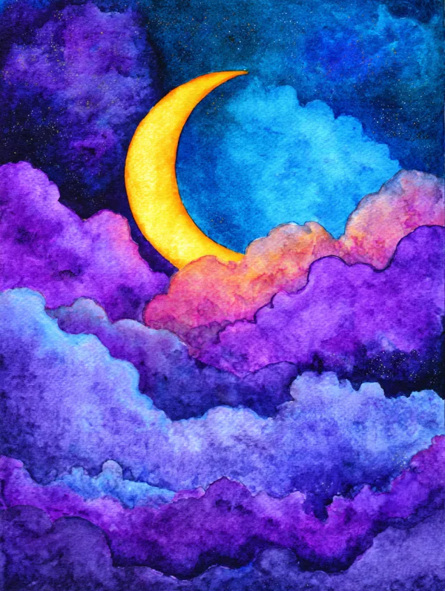 This watercolor painting shows a glowing crescent moon nestled among fluffy purple and blue clouds. The sky shifts from deep indigo to lighter blues, creating a magical nighttime atmosphere. The clouds are layered with soft rounded strokes that blend gently into one another. The moon stands out brightly at the center, giving the composition a dreamy glow.