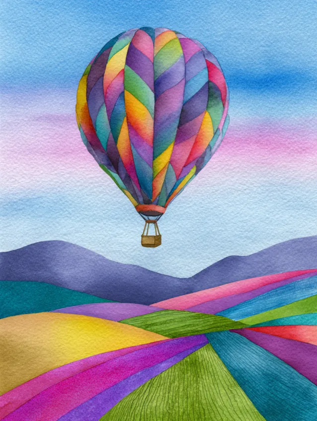 This watercolor painting highlights a vibrant hot air balloon floating above soft layered hills in playful shades of pink, green, and purple. The balloon itself is striped with bright rainbow colors that stand out against the gentle sky. The hills create simple depth with smooth curves, while the balloon remains the clear focal point. The composition feels uplifting and full of movement.