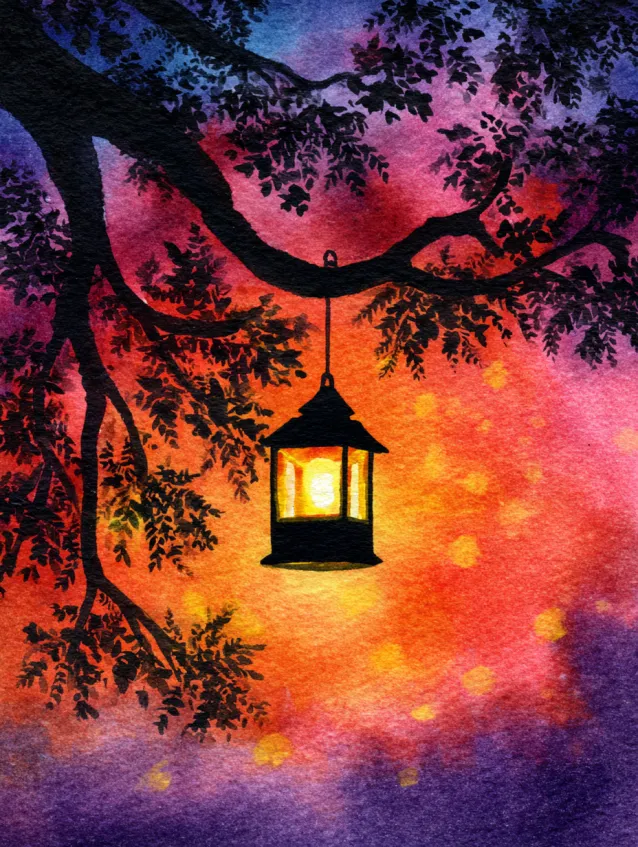 This watercolor painting captures a magical evening sky glowing in shades of fiery orange, pink, and deep purple. A dark tree branch stretches across the top, holding a softly lit lantern that casts a warm yellow glow against the vibrant background. The contrast between the silhouette and the colorful sky makes the composition feel dramatic yet simple. The blended washes in the sky create a smooth gradient, while the lantern remains the clear focal point in the center.