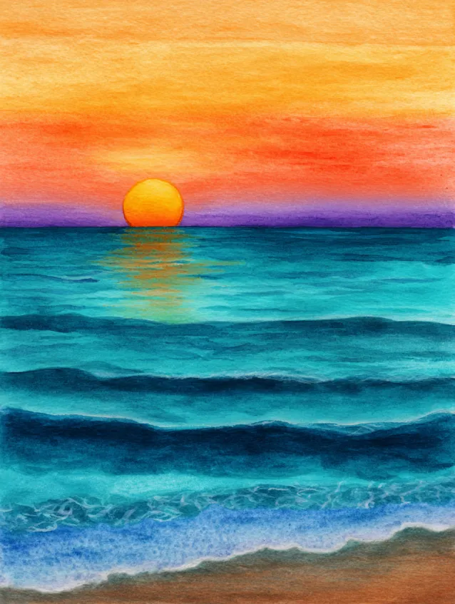 This watercolor painting captures a radiant sun dipping into the horizon over layered teal waves. The sky glows in warm orange and coral tones that reflect softly onto the water. The waves are painted with horizontal strokes, giving the ocean gentle movement. The contrast between warm sky and cool sea makes the composition vibrant and eye catching.